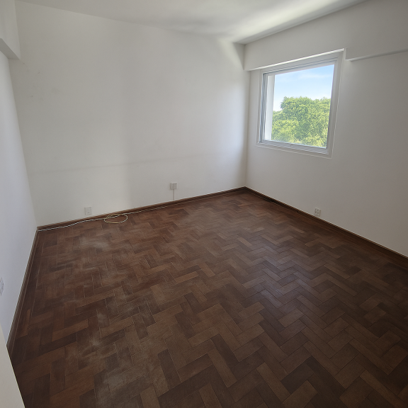 El departamento dispone de 3 dormitorios en total, todos con amplios placares. Uno de los dormitorios cuenta con baño en suite, mientras que los otros dos comparten un baño completo. Además, hay un dormitorio adicional de servicio con su propio baño.
