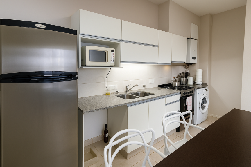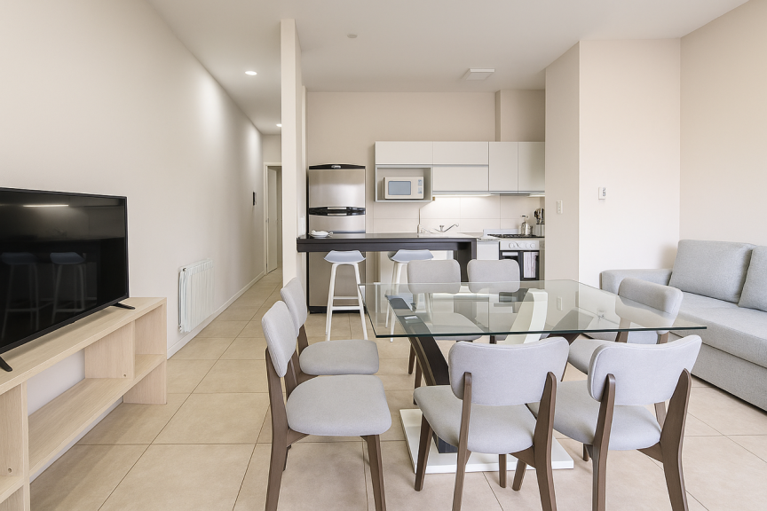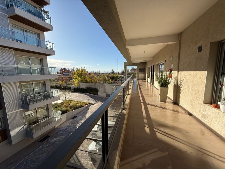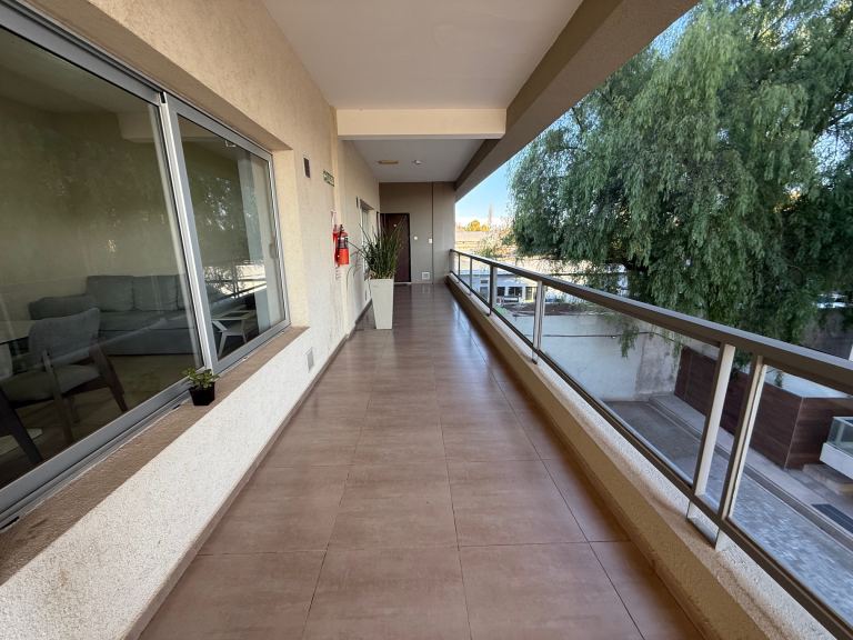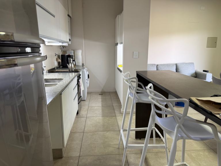 Posee gran living comedor con cocina semi integrada con barra de desayuno, toilette, 2 amplios dormitorios con placares, el principal con vestidor, 1 baño completo con ante baño. Además, posee un gran balcón. El departamento cuenta con cochera cubierta grande muy cómoda.