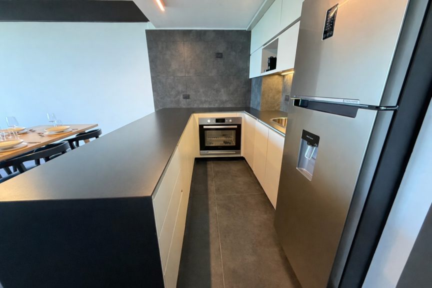 Cocina totalmente equipada, con alacenas y bajo mesadas, con una gran isla que sirve como barra de desayuno. (materiales de primer nivel).