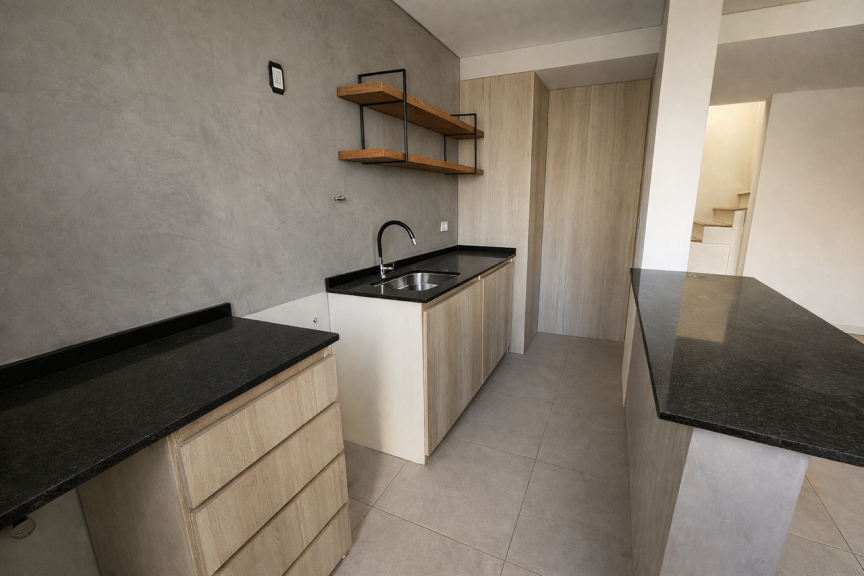 Posee en planta baja: amplio living comedor con la cocina semi integrada con barra de desayuno, toilette y un armario de guardado; en planta alta cuenta con amplio de hall de distribución (que puede ser usado como escritorio), 2 cómodos dormitorios con armarios hechos a medida y baño completo.